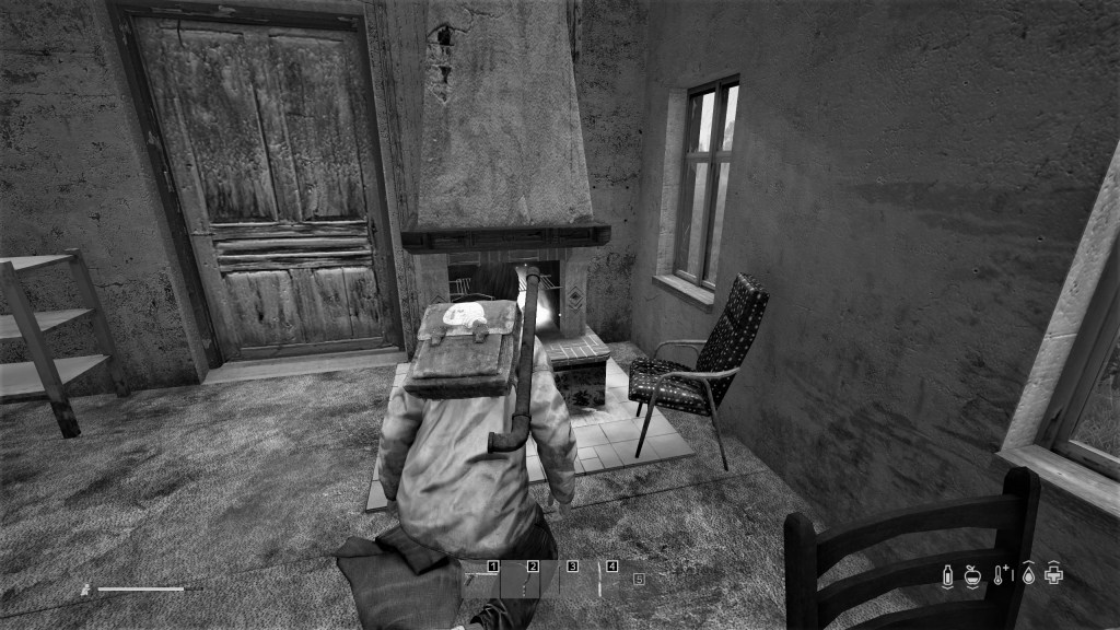 Nur ein Steinwurf entfernt befindet sich ein verlassener Bauernhof. Zusätzlich zum Schlottern kommt bei meinem Charakter jetzt auch noch ein leises Stöhnen, sobald ich ihn mit meiner Hochstelltaste zum Sprinten zwinge. Als ich bei den Gebäuden ankomme, ist das kleine Kreuz, das meine Gesundheit anzeigt, bereits gefährlich leer. Verzweifelt suche ich nach etwas Essbarem, und tatsächlich: Das muntere Gackern eines Huhns tönt hinter der Scheune hervor. Meine Rettung? Das Tier ist schnell gefangen, mit dem gefundenen Messer filetiert und verspeist. Roh? Egal, die Not kennt kein Gebot. Nur, schon nach kurzer Zeit erbreche ich meinen gesamten Mageninhalt zurück in die Landschaft. Nun bewege ich mich nur noch schleppend fort, Hunger, Durst und die sonderbare Krankheit manifestieren sich als dunkle Schlieren auf meinem Bildschirm, mein Sichtfeld verengt sich immer weiter. Ich höre noch ein dumpfes Geräusch, als mein Charakter auf den Boden sackt. „Du bist tot.“, erscheint in kleinen weißen Lettern da, wo gerade eben noch Wälder, Wiesen, Meer und Strand zu sehen waren.